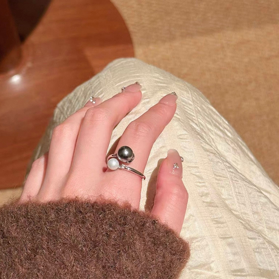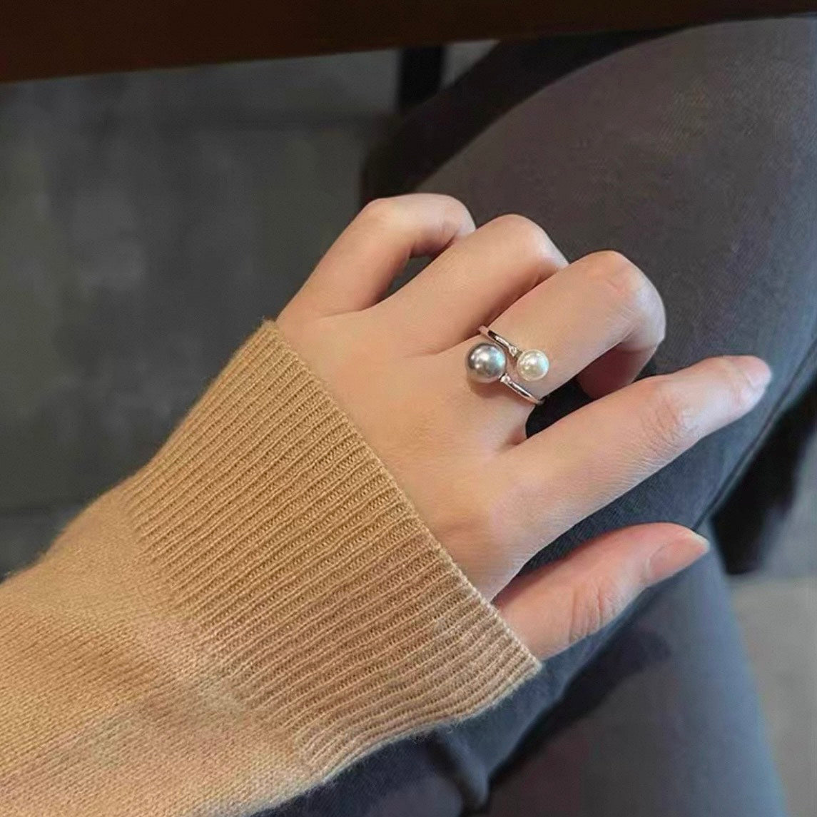 白と黒、2つのパールが上品に輝くリング。