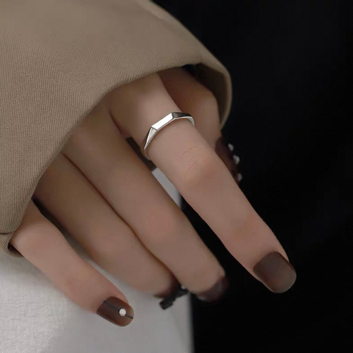 シャープなエッジラインが光を繊細に反射し、指先に都会的なニュアンスを添えるスリムリング。