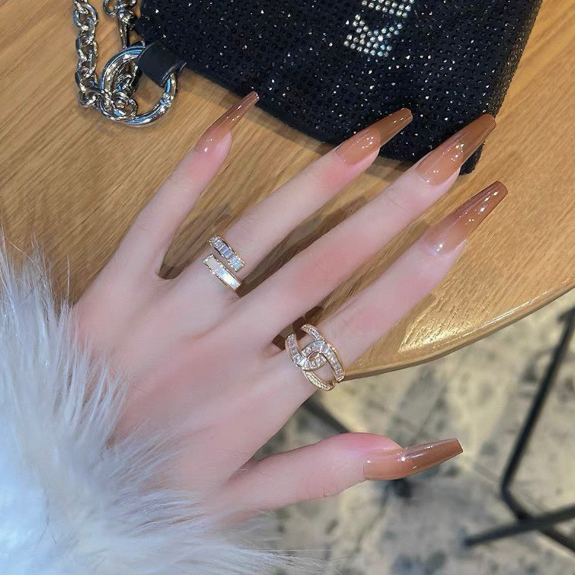 優美にループするラインが指先を包み込み、クリアストーンが光を反射して凛と輝くリング。